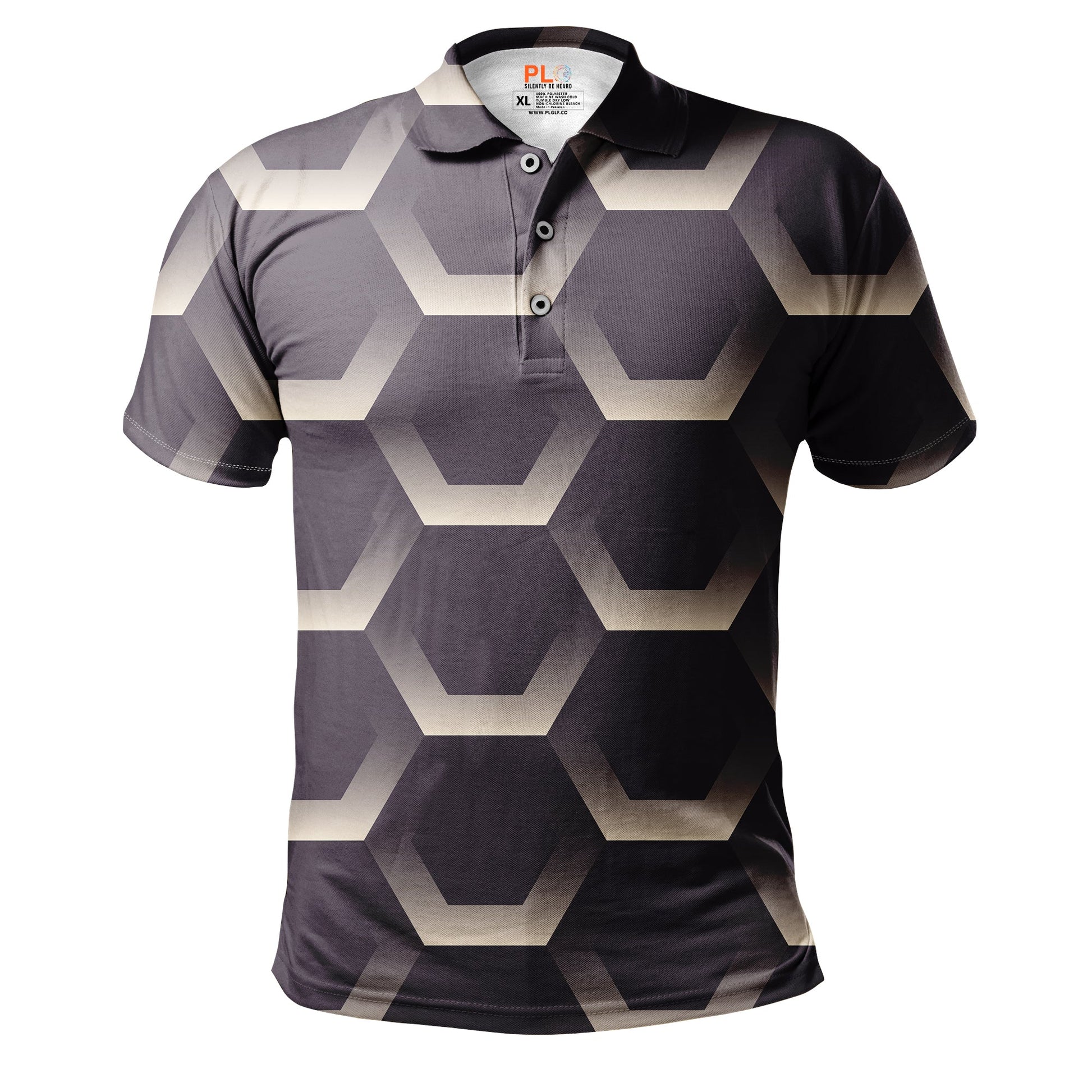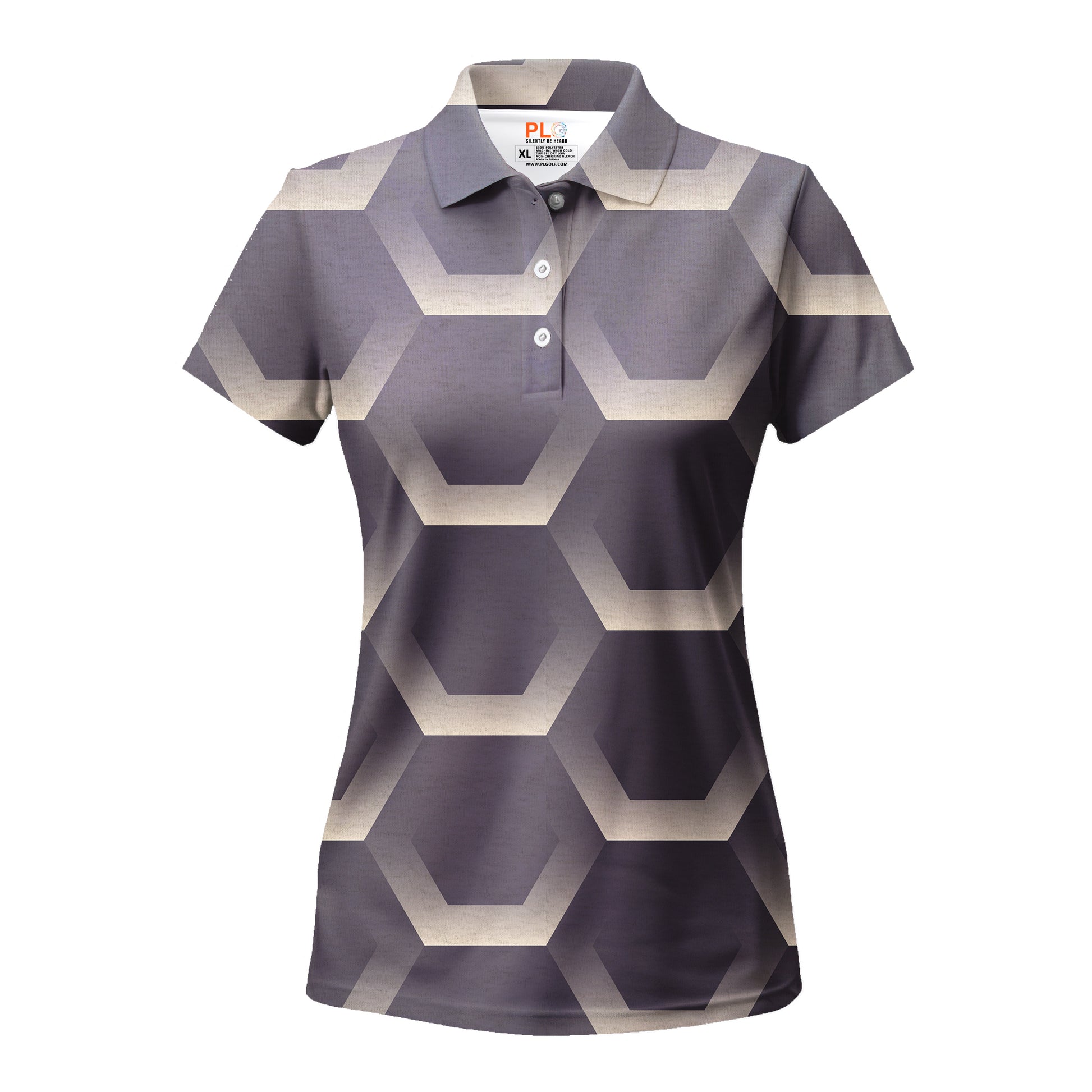 Structure meets style. Bronze Hive features a sophisticated honeycomb pattern with glowing beige and bronze outlines against a deep charcoal background. The geometric design creates a sense of depth and stability, perfect for the golfer who builds her game on a solid foundation and looks good doing it.
