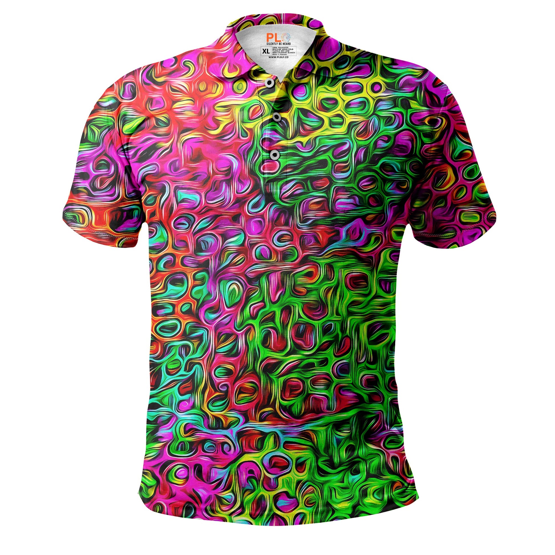 Color: Get ready for a psychedelic ride with the Brushstroke polo. This shirt is a swirl of vibrant greens, purples, and reds, creating an abstract, artistic look that is perfect for golfers who love to express their bold, creative side.