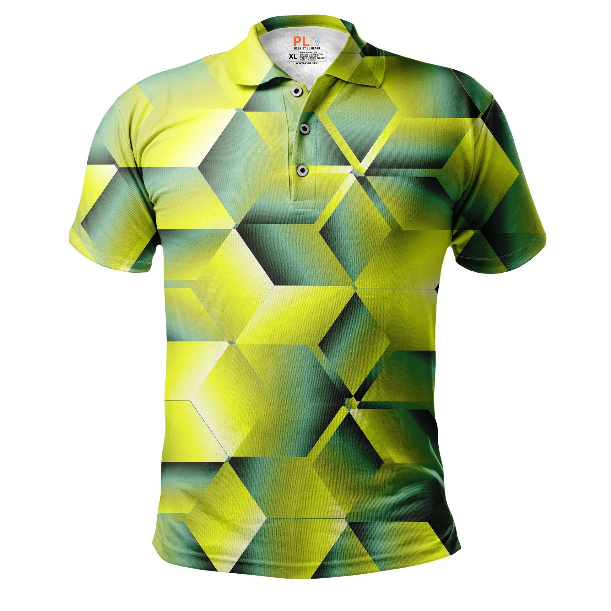 Citrus captures the zest of a sunny day on the course with its sharp geometric shapes and a refreshing palette of lime and lemon hues. Perfect for the golfer who brings energy to every round, this shirt's design mirrors the dynamic angles and trajectories of a well-played game.