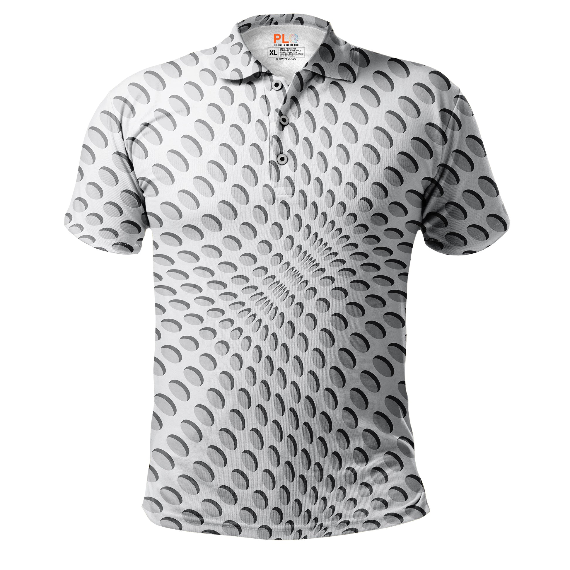 Step into the zone. Silver Portal features a mesmerizing optical illusion design that draws the eye inward. With its spiraling grey dots on a clean white background, this shirt creates a sense of motion and intense focus—perfect for locking in on that next big putt.