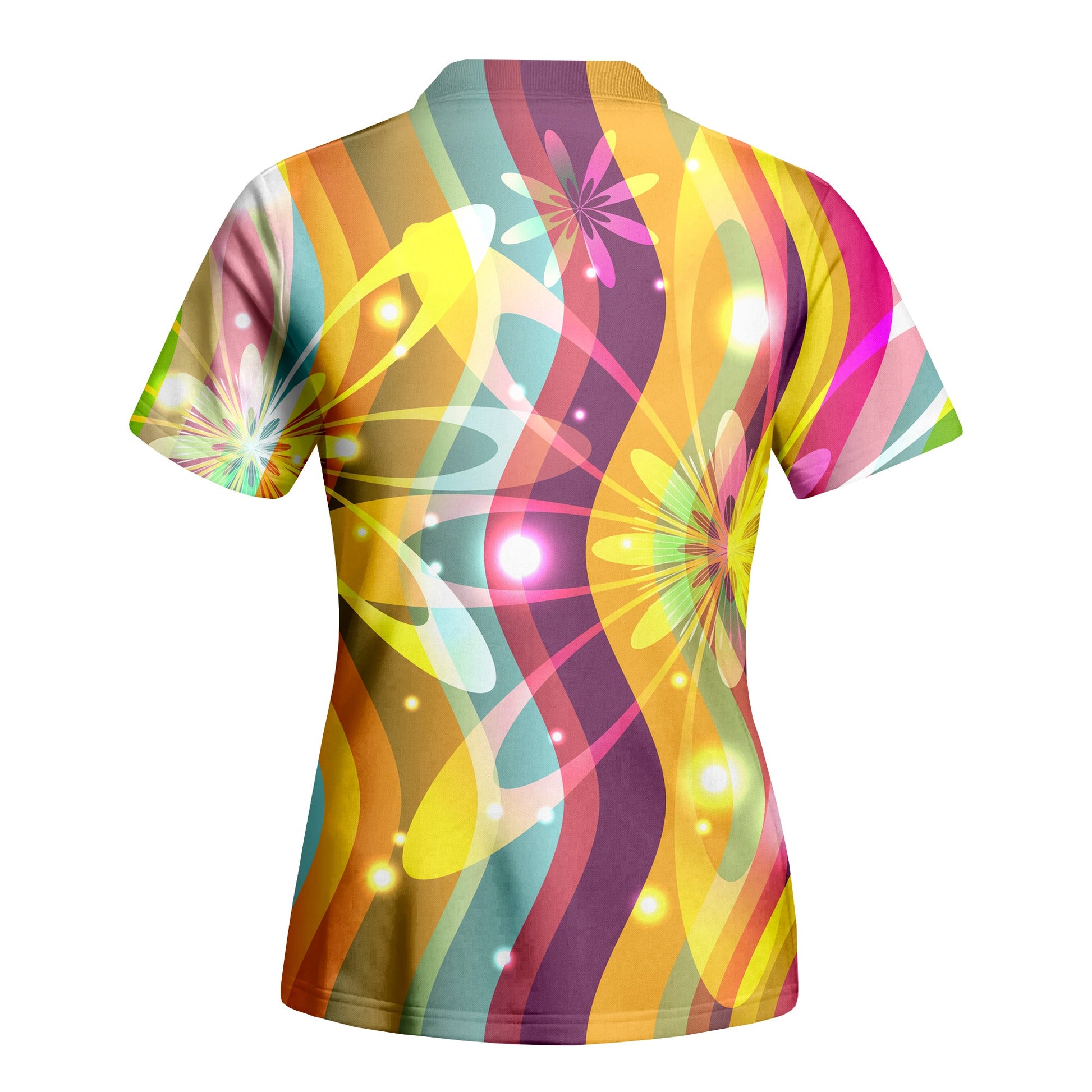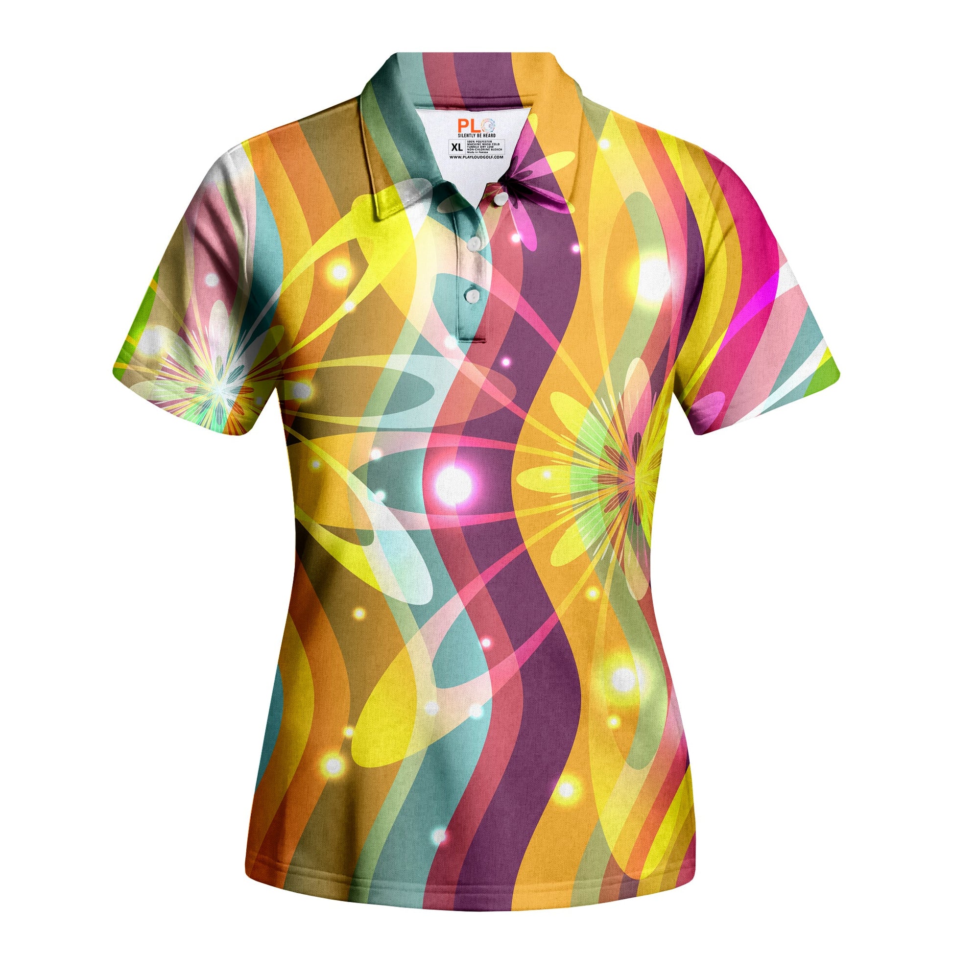 Dazzle on the fairway with the Sunshine Swirl polo, where every swing glimmers with fun! With its sun-kissed colors and sparkling light patterns, this shirt is a cheerful celebration for the junior golfer who's ready to shine bright and score low.