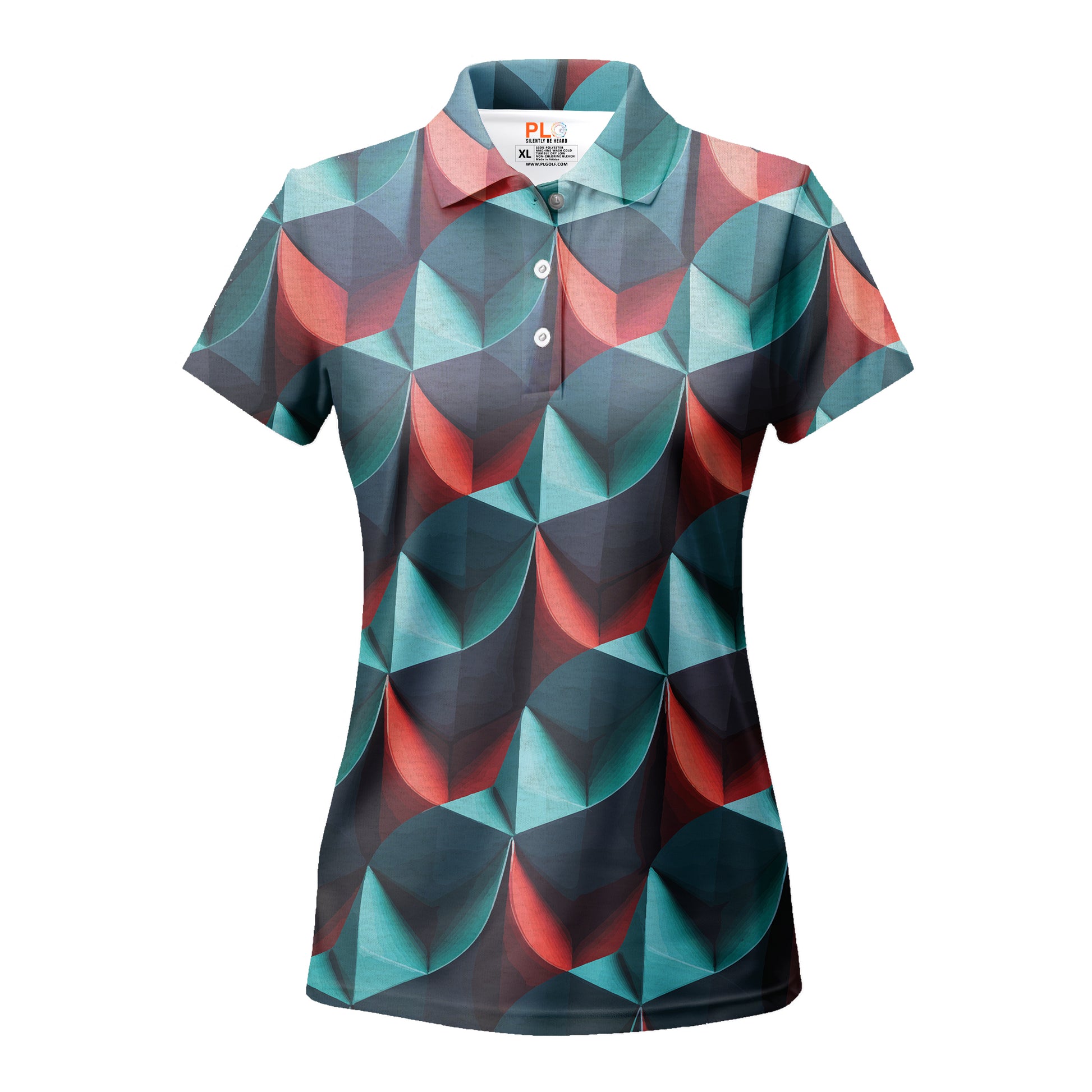 Pop off the shirt. Teal Dimension features a bold 3D cubic pattern that mixes cool teals with contrasting rust-red accents. The depth of the design grabs the eye, making it a standout piece for the golfer who isn't afraid to add a little geometric flair to her wardrobe.