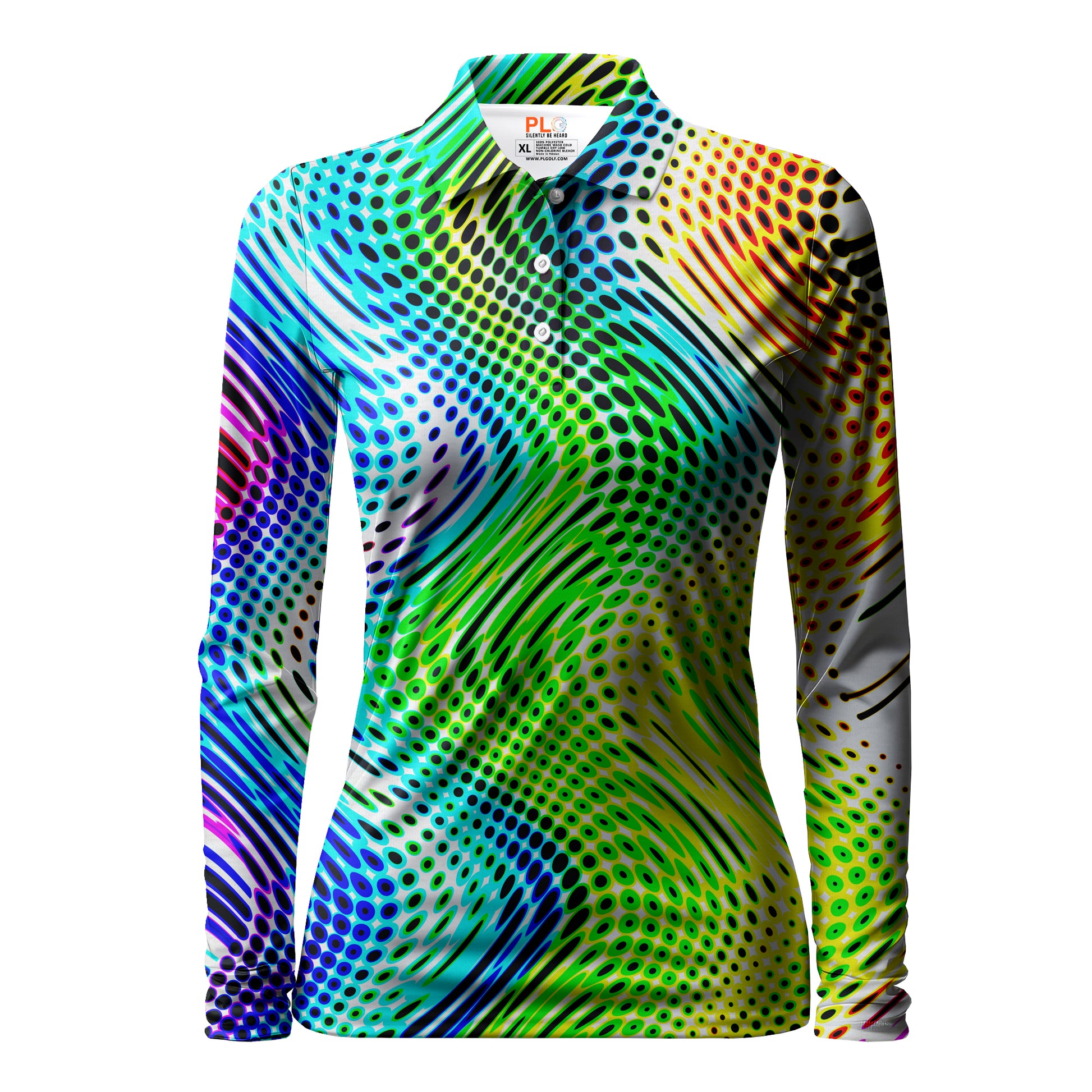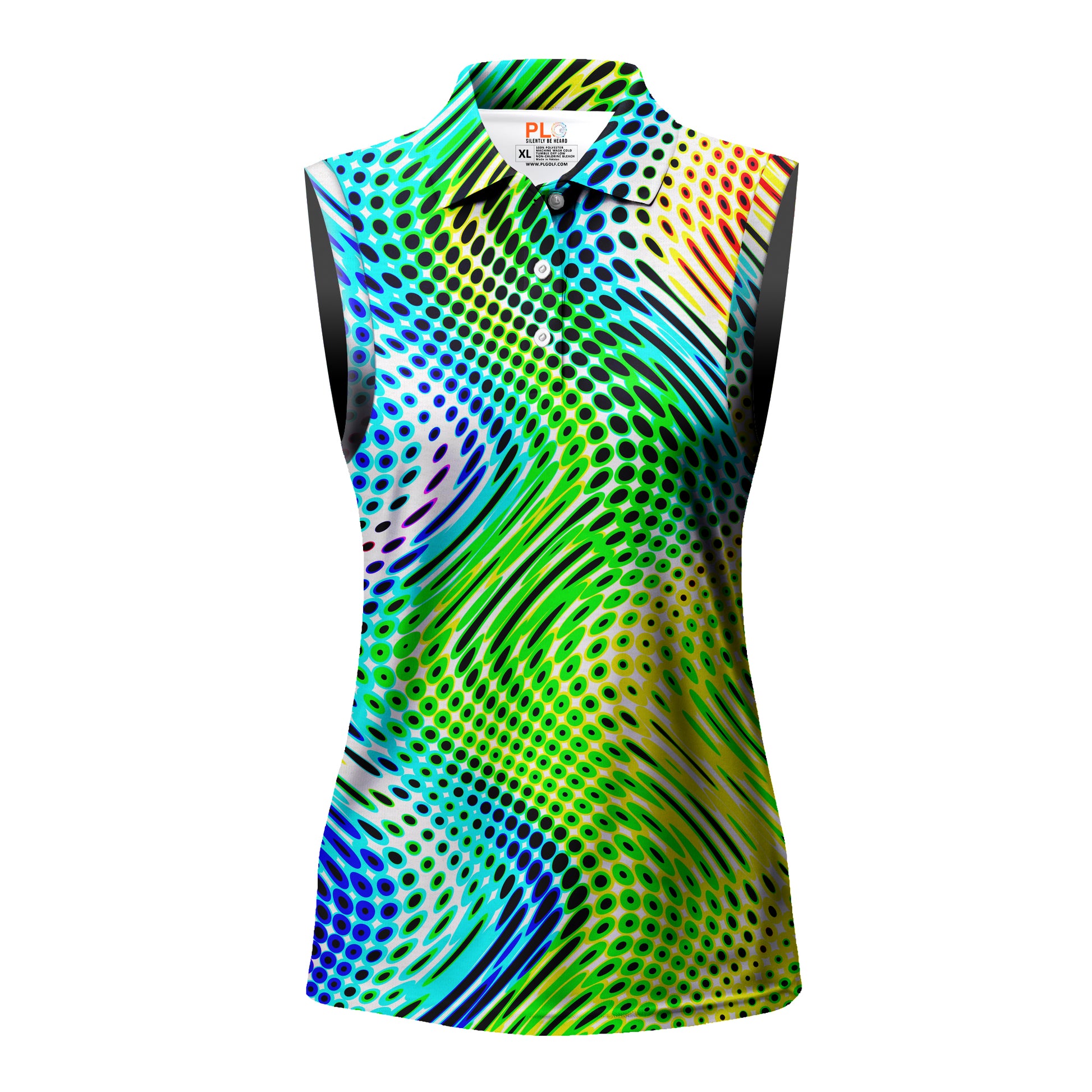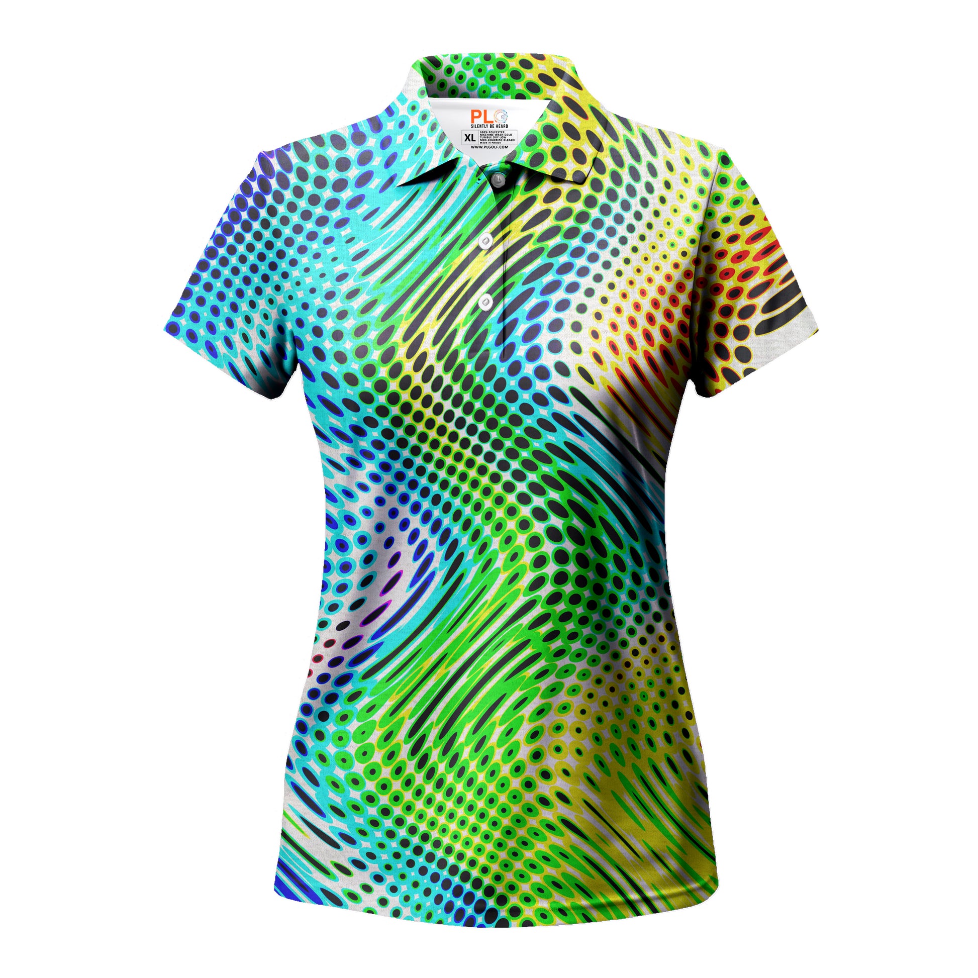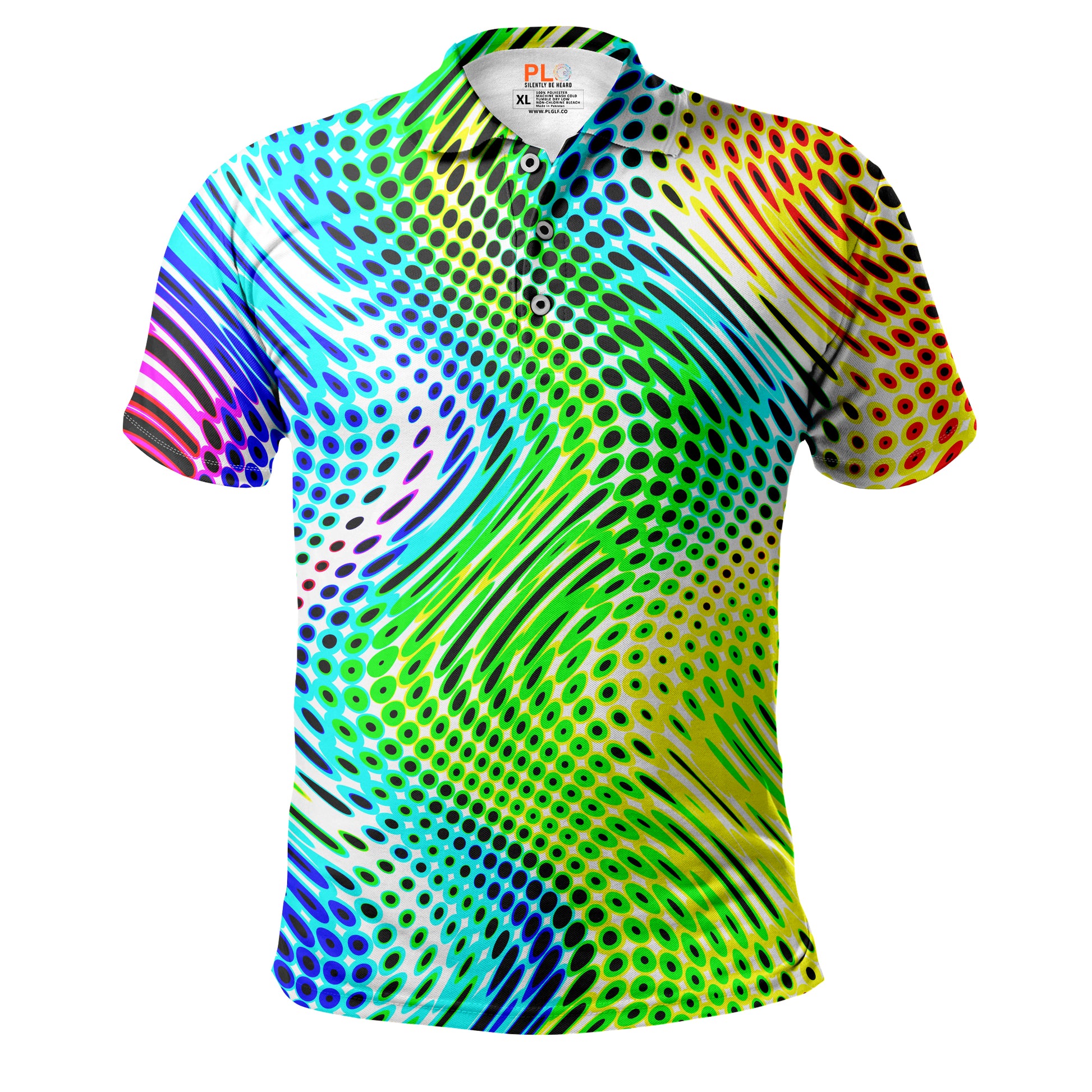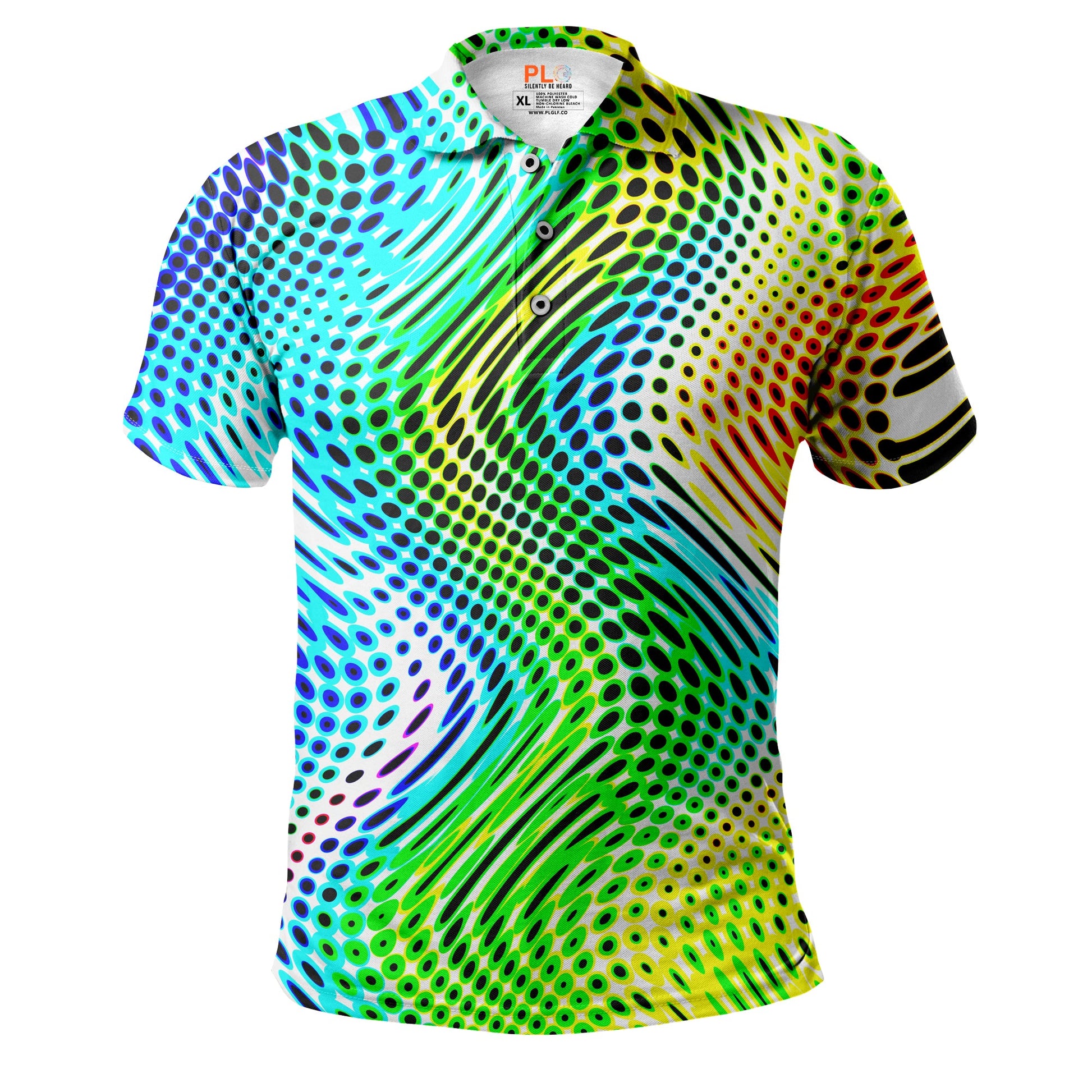 The Vortex Polo pulls you in with a bold, hypnotic swirl of neon greens, blues, and fiery reds that ripple like pure energy across the fairway. This shirt isn’t just a head-turner — it’s built for golfers who thrive on standing out and playing loud, with performance fabric that keeps you cool and confident from tee to clubhouse.