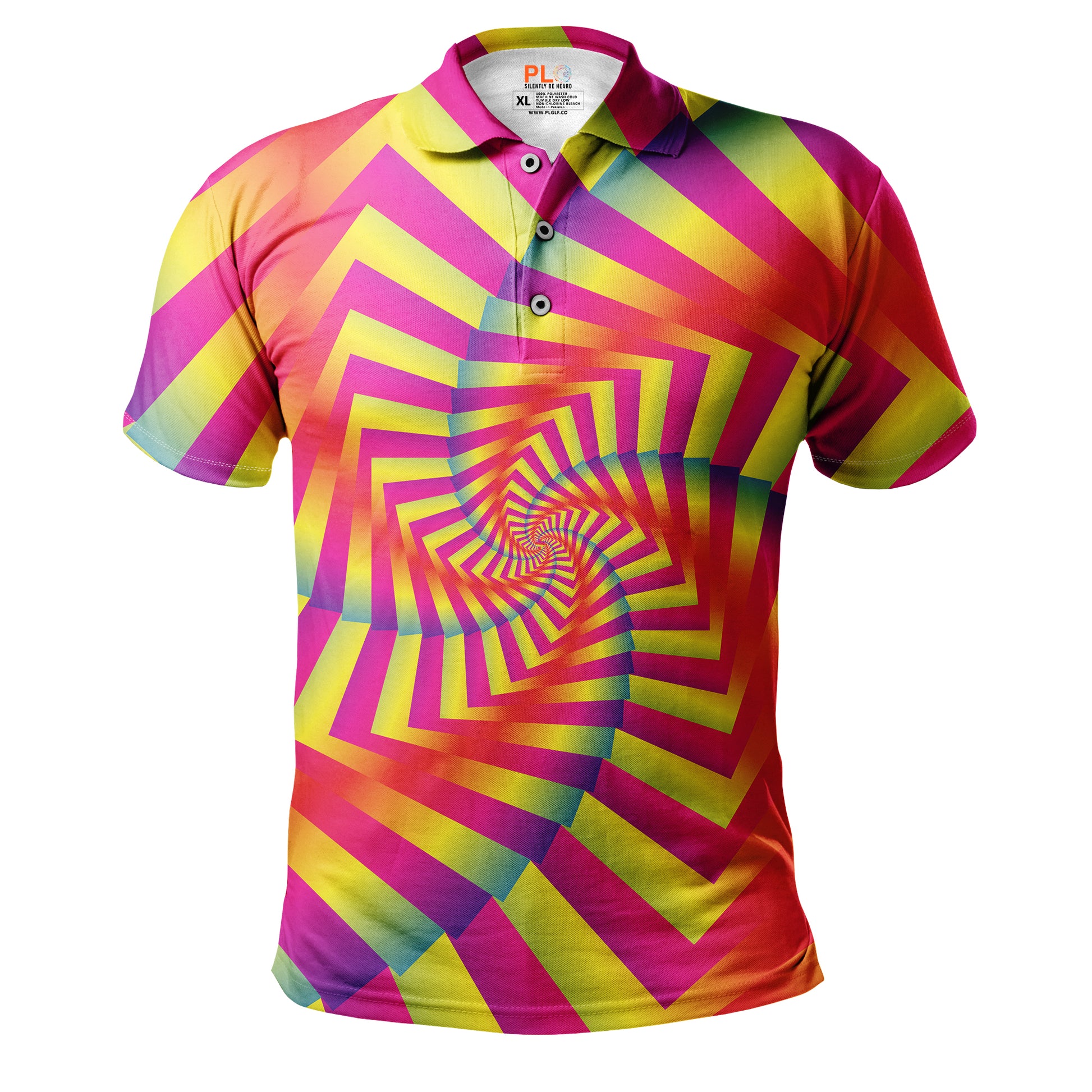 Eyes on the prize. Tunnel Vision features a trippy, spiraling square pattern in electric pink, yellow, and blue. The design draws the eye inward, symbolizing the intense focus needed to sink that long birdie putt.