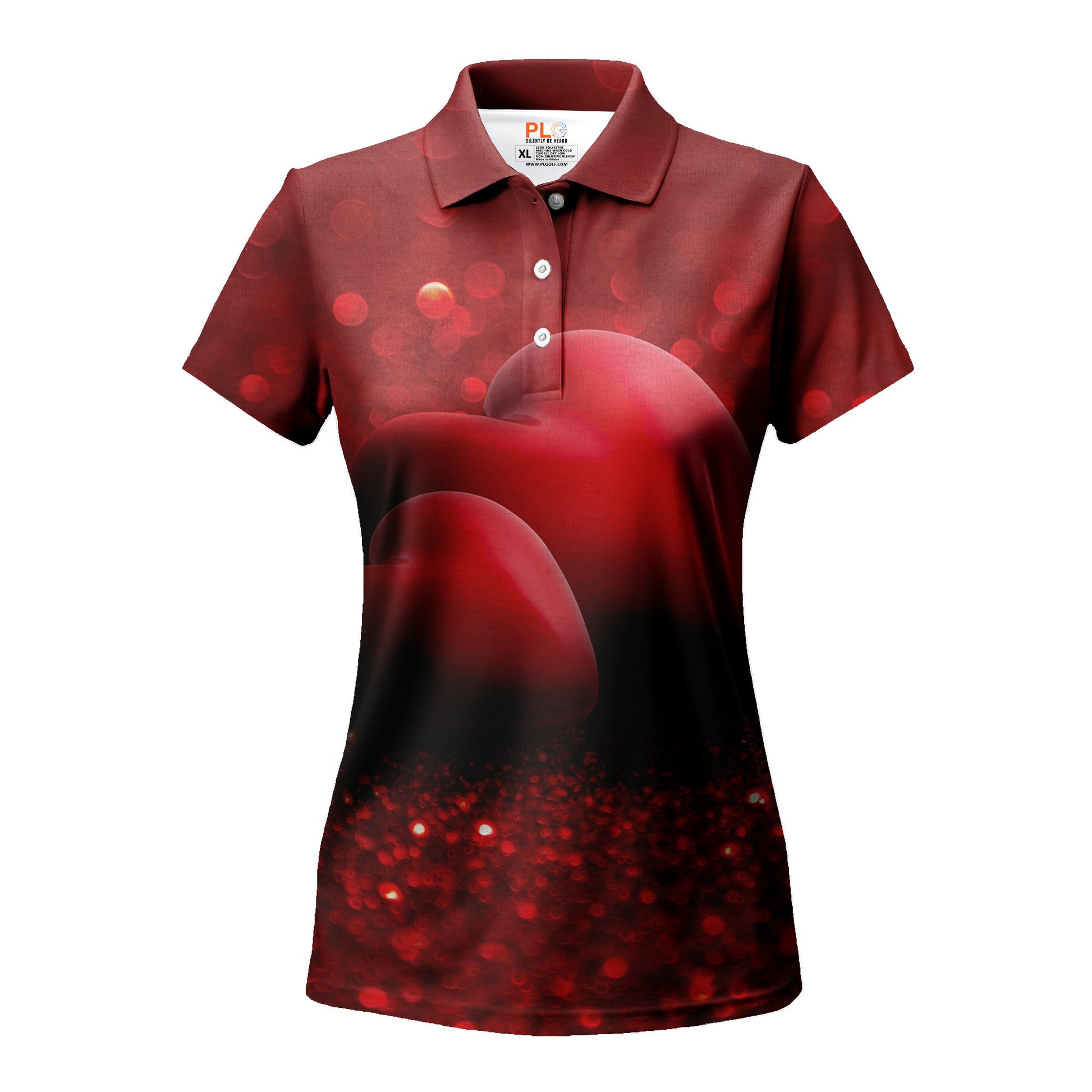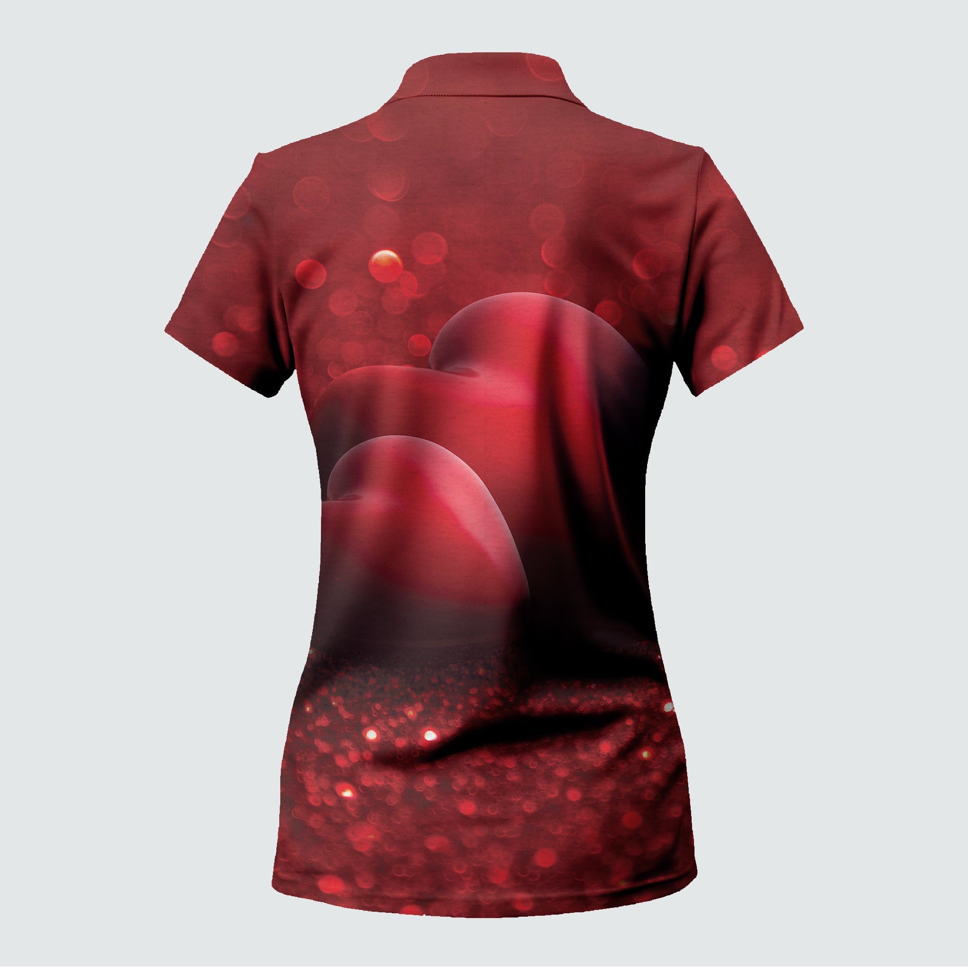 Velvet Embrace is a deep dive into the essence of love with its rich, velvety reds that seamlessly blend into a dark, captivating base. The shirt features an abstract heart enveloped in a bokeh of lights, symbolizing the warmth and sparkle of romance perfect for the golfer who brings passion to every play.